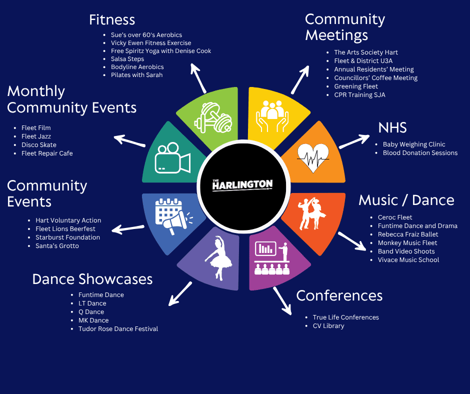 Following 18 months of concerted effort by Hart District Council, Hampshire County Council and Fleet Town Council in designing a new civic complex, the initiative collapsed with the withdrawal of the developer funding. Fleet Town Council took the initiative to employ a professional manager to re-brand, market and run “The Harlington” and bring the facility back to being the entertainment and community heart of Fleet.