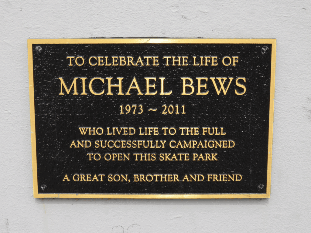 The skatepark has a memorial plaque in memory of Michael Bews who campaigned to have the skatepark opened.